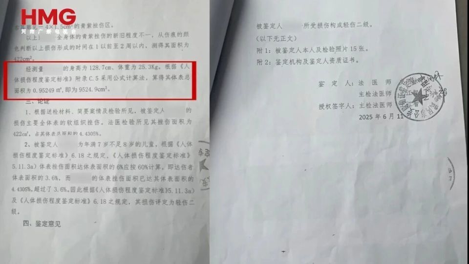 丁女士立即报了警,武冈市公安局出具的轻薄书自大:孩子体表瘀青面积达4522 cm²,而小元宝体表总面积约为9525 cm²。瘀青面积杰出了孩子体表总面积的47%!