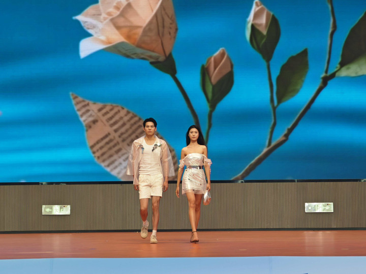 现场最“炫酷”的,还要数广东海洋大学学生献艺的一场格外的服装秀——模特们身穿用毁灭报纸、快递泡泡棉、保温袋、碎光盘等毁灭物纠正的服装,踩着节律走上T台。