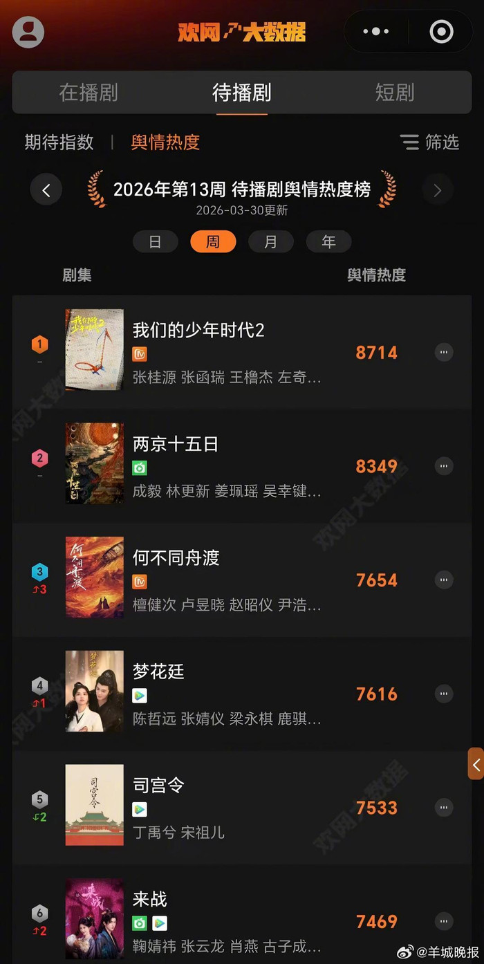 [#咱们的少年时间2热度超两京十五日#]《咱们的少年时间2》自2026年3月官宣以来,以衔接多日登顶待播剧舆情热度榜的亮眼发扬成为暑期档最受祥和的芳华剧。据欢网大数据统计,该剧在3月14日至3月30日历间,衔接8天稳居待播剧日榜前三,其中6次登顶单日榜首,博亚体育app舆情峰值高达9078,位列2026年待播剧年榜第三。同时屡次打败成毅《两京十五日》等明星声势剧集,并在第12周和第13周衔接拿下周榜冠军。该剧由@TF眷属-张桂源@TF眷属-张函瑞@TF眷属-王橹杰LJW@TF眷属-左奇函@TF眷属-陈奕恒Jonathan@TF眷属-杨博文YBW@TF眷属-陈念念罕_SH@TF眷属-陈浚铭chen(名次不分前后,按年齿大小排序)主演,你期待吗?宽容在批驳区聊聊~~戳更多>>#曝宋宁峰周迅仳离原因##内田有纪柏原崇成亲##李连杰短剧##宋宁峰回复婚内出轨##丝芭告状月鳞绮纪承制方##张雨绮直播活气#(裁剪:郑宗敏;审签:岑杰昌)